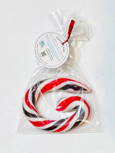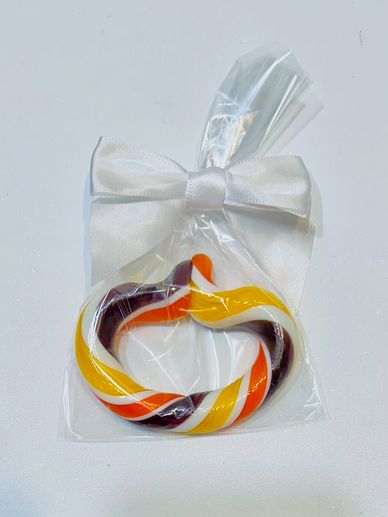 Pumpkin shaped candy cane individually wrapped. Flavor: pumpkin spice cheesecake